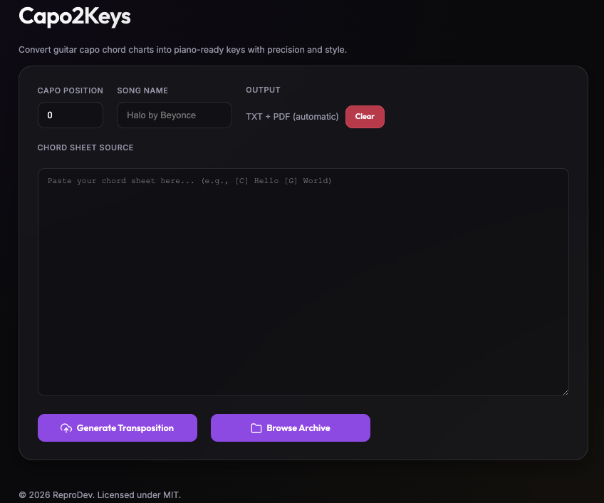 Introducing Capo2Keys, a GUI tool built in Flask but deployed as a Docker container with Web UI to help convert and then export, guitar capo chord charts into piano-ready keys as a PDF and TXT file, all while preserving lyrics and chord structure.